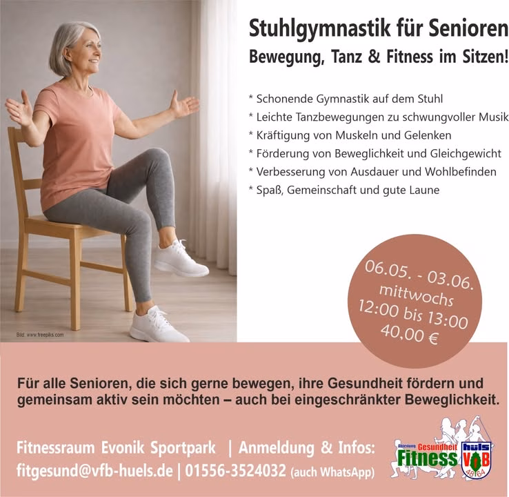 🪑💃 Stuhlgymnastik für Senioren – Bewegung, Tanz & Fitness im Sitzen! Bleiben Sie fit, beweglich und voller Lebensfreude! Unsere Stuhlgymnastik für Senioren verbindet sanfte Fitnessübungen mit Musik und kleinen Tanzelementen – alles bequem und sicher im Sitzen. ✨ Das erwartet Sie: * Schonende Gymnastik auf dem Stuhl * Leichte Tanzbewegungen zu schwungvoller Musik * Kräftigung von Muskeln und Gelenken * Förderung von Beweglichkeit, Koordination und Gleichgewicht * Verbesserung von Ausdauer und Wohlbefinden * Spaß, Gemeinschaft und gute Laune Die Übungen sind einfach, sicher und für jedes Fitnessniveau geeignet. Es sind keine Vorkenntnisse nötig – jeder kann mitmachen! 👵🧓 Für wen ist das geeignet? Für alle Senioren, die sich gerne bewegen, ihre Gesundheit fördern und gemeinsam aktiv sein möchten – auch bei eingeschränkter Beweglichkeit. 🌟 Tun Sie sich und Ihrem Körper etwas Gutes – bleiben Sie aktiv! 📅 Termine: 06.05. bis 03.06.2026 – mittwochs 12-13 Uhr 📍 Ort: Fitnessraum Evonik-Sportpark 📞 Anmeldung / Info: 01556 – 352 40 32 (WhatsApp / Tel.) oder Mail fitgesund@vfb-huels.de Bewegung hält jung – wir freuen uns auf Sie!